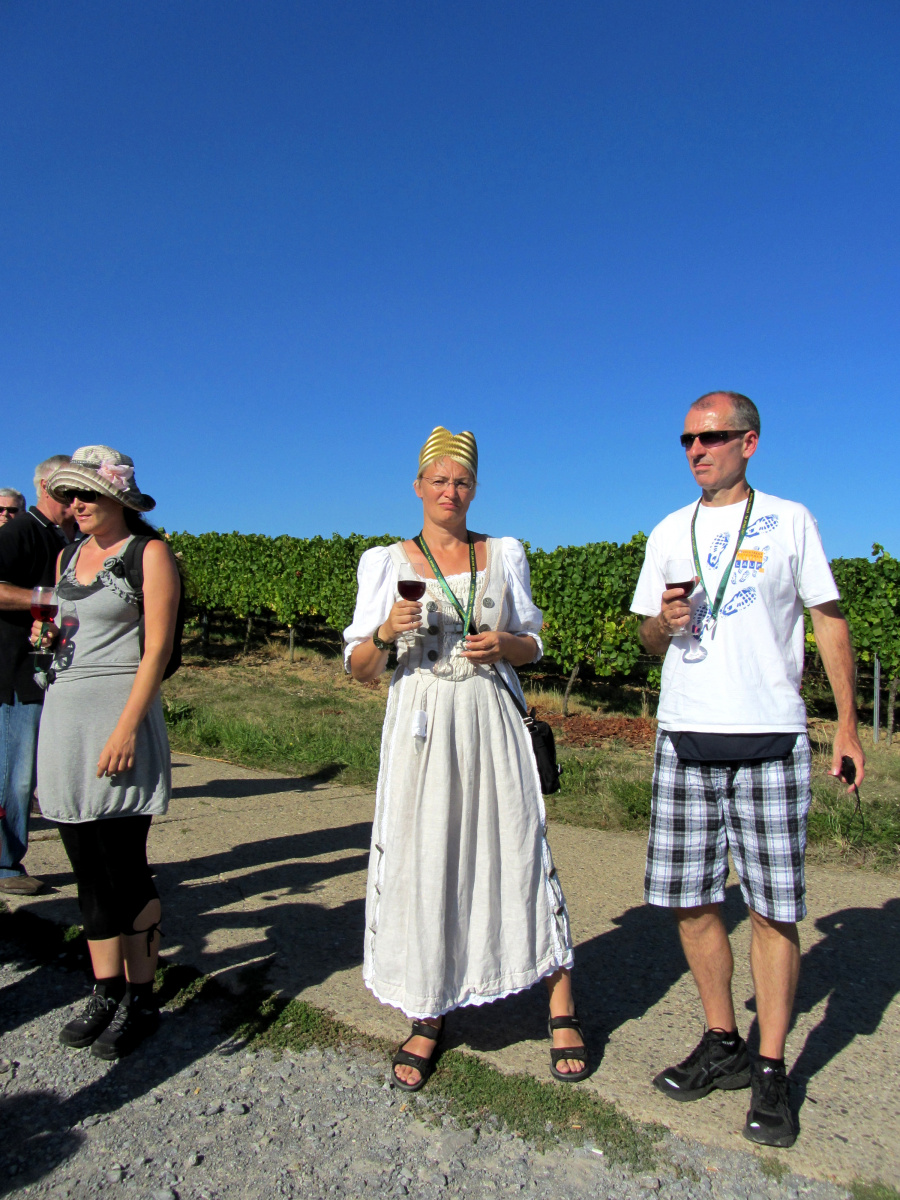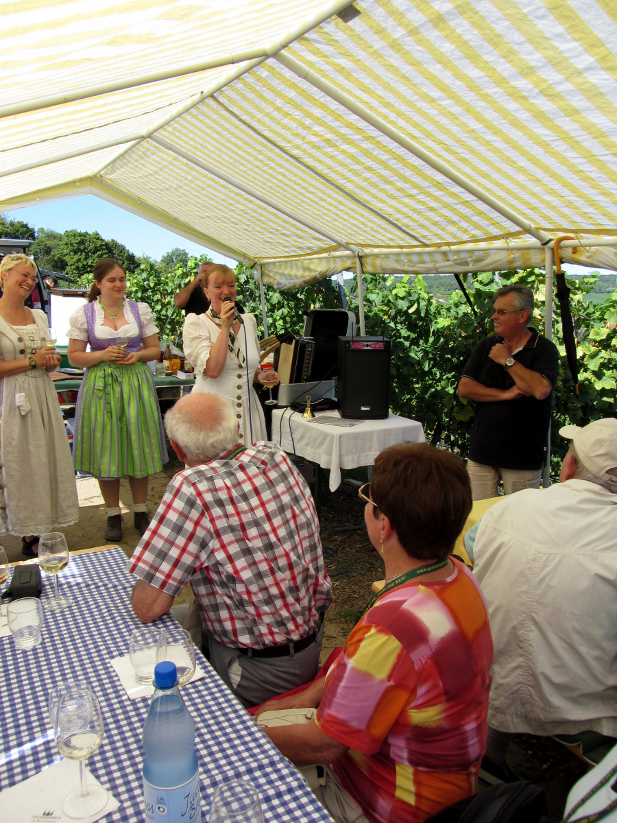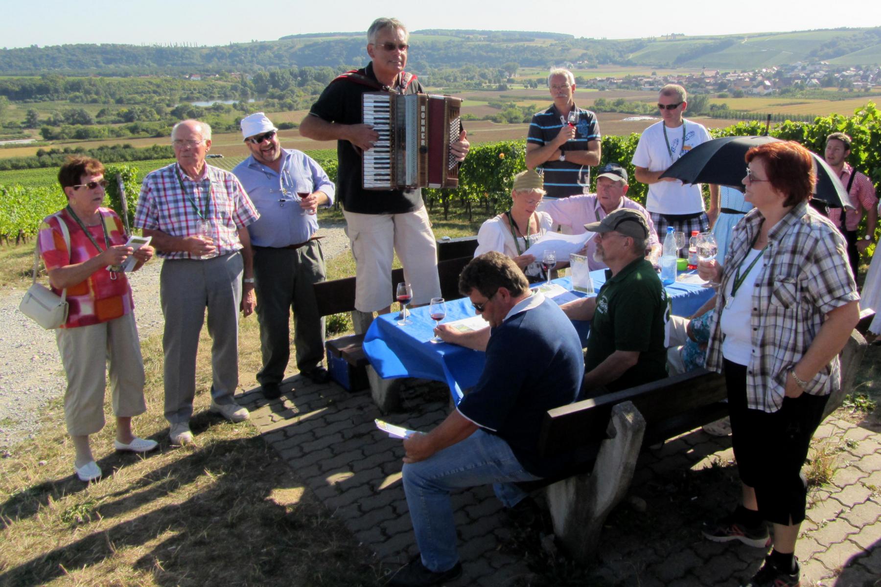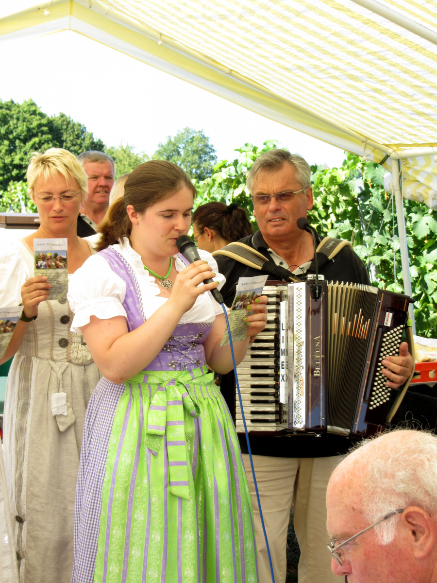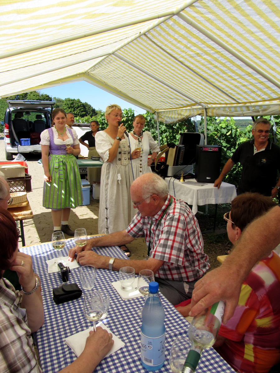Ein wunderschönes verlängertes Wochenende verbrachten wir bei unserem Ausflug ins Fränkische Weinland. Am Freitag, den 07.09. reisten wir bei Kaiserwetter an und nach einem Mittagessen ging’s auch schon auf Wanderschaft nach Volkach. Dort hatten wir den Rest des Tages zur freien Verfügung, was einige für einen Ausflug ins Wikingerdorf, andere für einen gemütlichen Abend in unserer Unterkunft nutzten. Am Samstag stand die große Weinerlebniswanderung auf dem Plan. Neben den wunderschönen Wegen durch die fränkischen Weinberge, die wir teils zu Fuß und teils per Traktoranhänger zurücklegten, gab’ es viele Dinge für uns zu lernen: wir wissen jetzt, wie das Frankenlied geht, wie Fränkischer Rotling gemacht wird, warum der Silvaner ein Männerwein ist und vieles anderes mehr. Im Gegenzug wissen die Franken jetzt natürlich auch wie das Badnerlied geht. Höhepunkt der Weinwanderung war die Wahl Ihrer königlichen Hoheit Uli zur Weinwanderkönigin. Unter vielen Huldigungsbezeugungen für Ihre Majestät ging es zurück zu unserer Unterkunft, der Rose in Obereisenheim. Dort gaben wir ein viel umjubeltes Platzkonzert und ließen den Tag ausklingen – die einen kürzer, die anderen länger. Am Sonntag Morgen starteten wir zu unserer Stadtbesichtigung nach Würzburg um im Anschluss in einem gemütlichen Biergarten unser Ausflugsprogramm zu beenden. Es war eine tolle Fahrt in eine wunderschöne Gegend. Herzlichen Dank an Eugen, unseren „Vergnügungsminister“, für die Organisation des unvergesslichen Ausflugs.