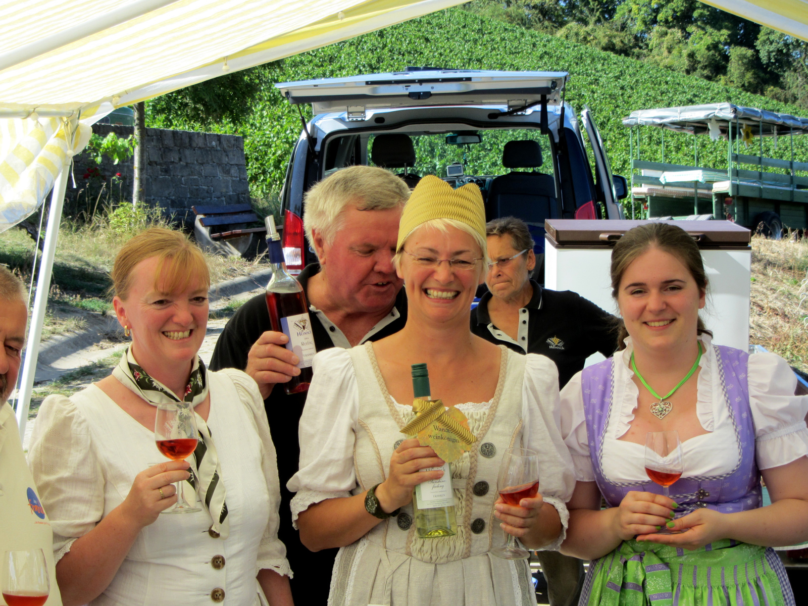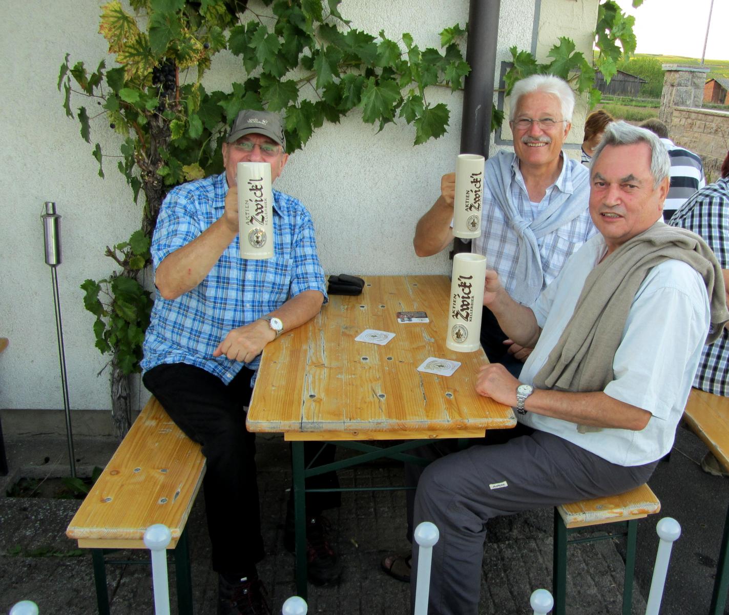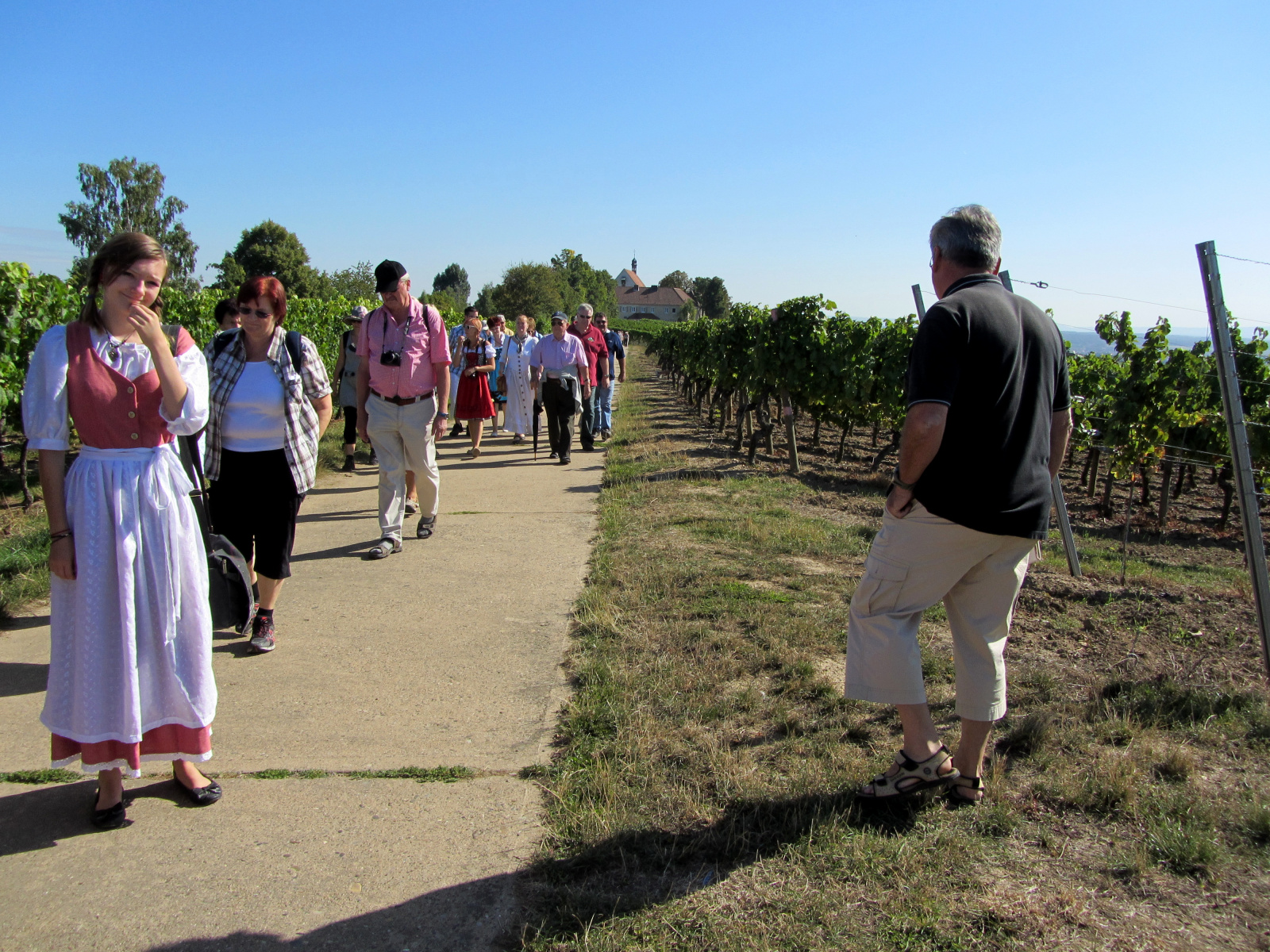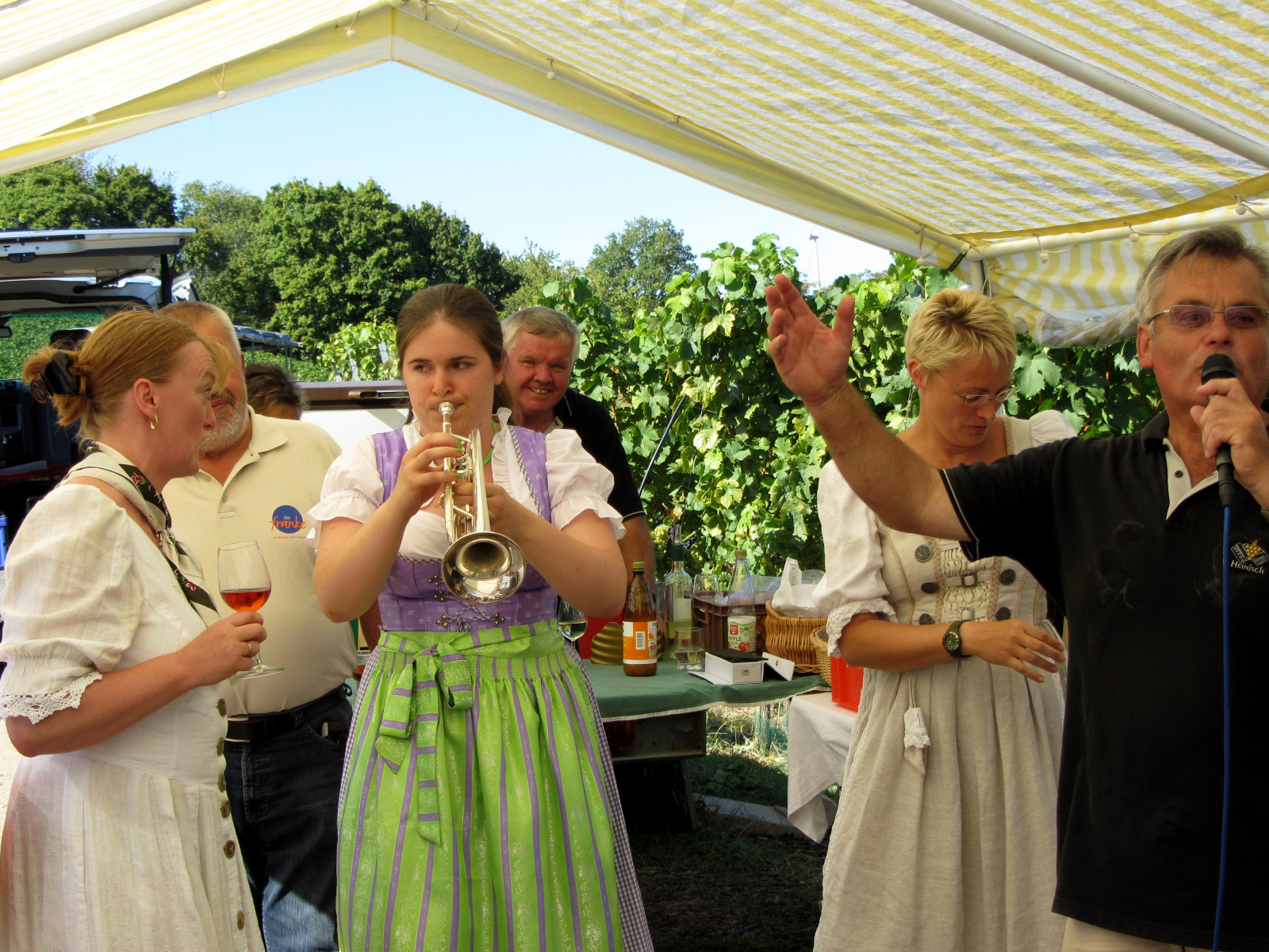 Ein wunderschönes verlängertes Wochenende verbrachten wir bei unserem Ausflug ins Fränkische Weinland. Am Freitag, den 07.09. reisten wir bei Kaiserwetter an und nach einem Mittagessen ging’s auch schon auf Wanderschaft nach Volkach. Dort hatten wir den Rest des Tages zur freien Verfügung, was einige für einen Ausflug ins Wikingerdorf, andere für einen gemütlichen Abend in unserer Unterkunft nutzten. Am Samstag stand die große Weinerlebniswanderung auf dem Plan. Neben den wunderschönen Wegen durch die fränkischen Weinberge, die wir teils zu Fuß und teils per Traktoranhänger zurücklegten, gab’ es viele Dinge für uns zu lernen: wir wissen jetzt, wie das Frankenlied geht, wie Fränkischer Rotling gemacht wird, warum der Silvaner ein Männerwein ist und vieles anderes mehr. Im Gegenzug wissen die Franken jetzt natürlich auch wie das Badnerlied geht. Höhepunkt der Weinwanderung war die Wahl Ihrer königlichen Hoheit Uli zur Weinwanderkönigin. Unter vielen Huldigungsbezeugungen für Ihre Majestät ging es zurück zu unserer Unterkunft, der Rose in Obereisenheim. Dort gaben wir ein viel umjubeltes Platzkonzert und ließen den Tag ausklingen – die einen kürzer, die anderen länger. Am Sonntag Morgen starteten wir zu unserer Stadtbesichtigung nach Würzburg um im Anschluss in einem gemütlichen Biergarten unser Ausflugsprogramm zu beenden. Es war eine tolle Fahrt in eine wunderschöne Gegend. Herzlichen Dank an Eugen, unseren „Vergnügungsminister“, für die Organisation des unvergesslichen Ausflugs.