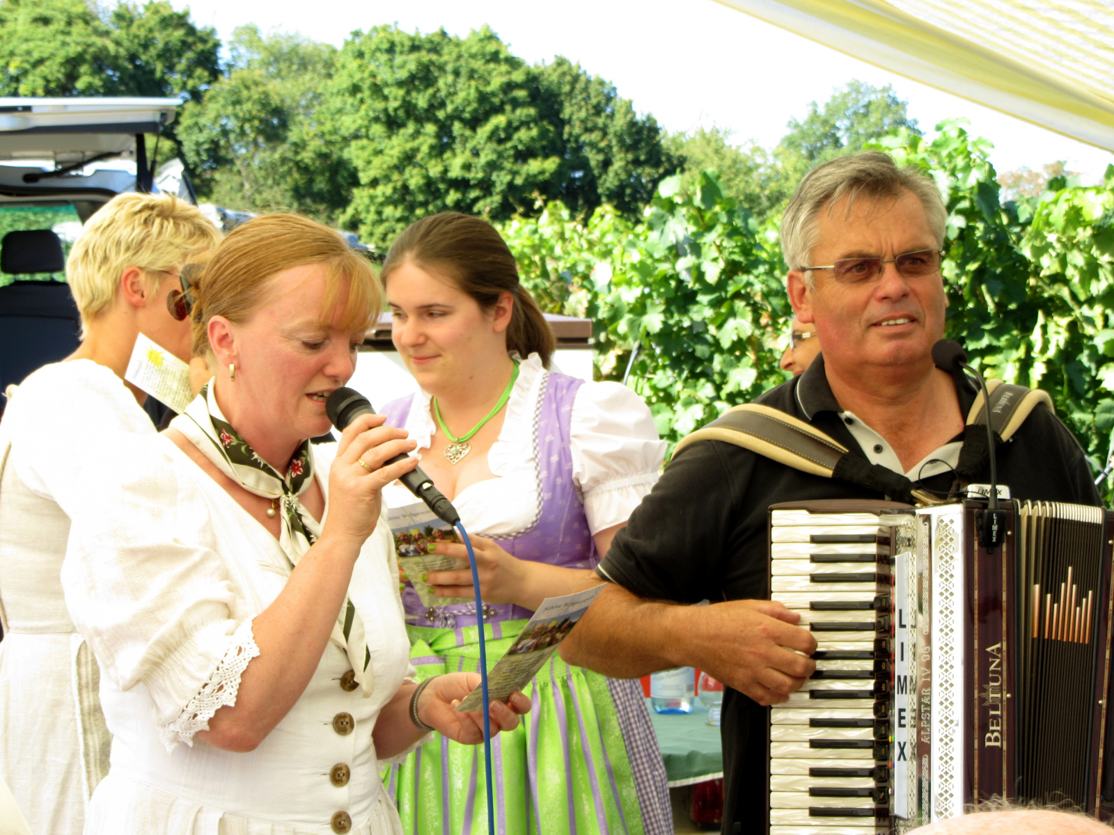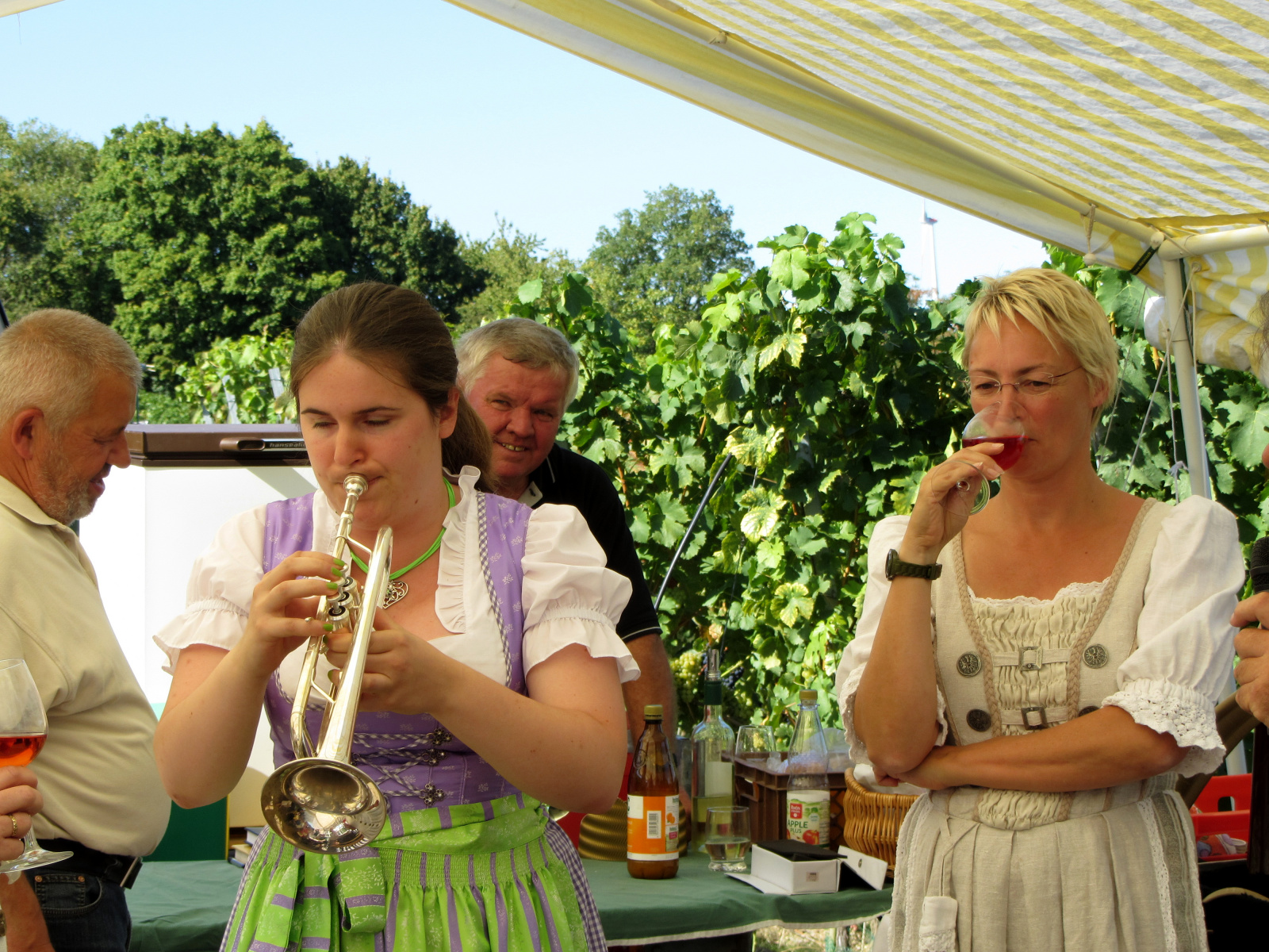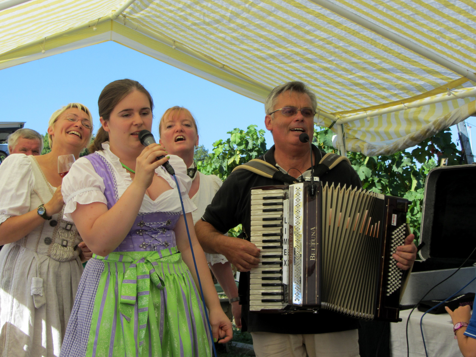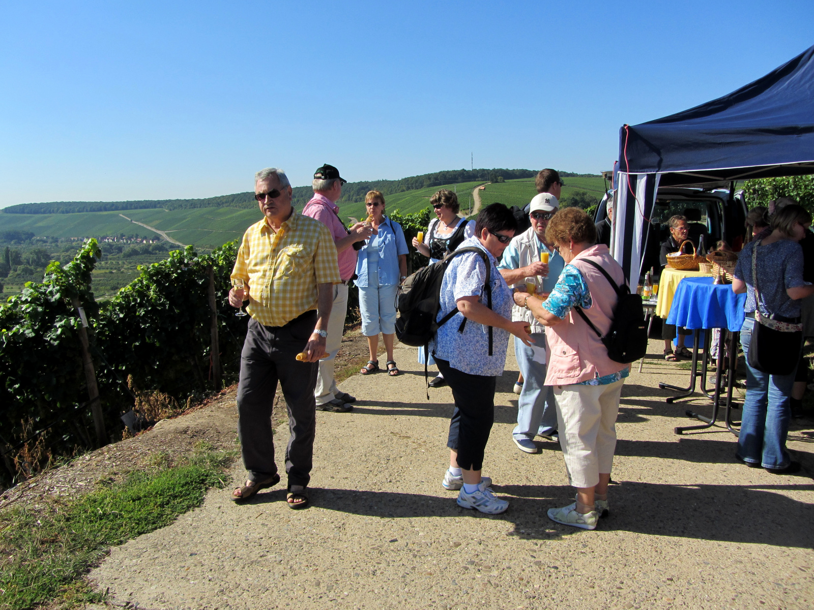 Ein wunderschönes verlängertes Wochenende verbrachten wir bei unserem Ausflug ins Fränkische Weinland. Am Freitag, den 07.09. reisten wir bei Kaiserwetter an und nach einem Mittagessen ging’s auch schon auf Wanderschaft nach Volkach. Dort hatten wir den Rest des Tages zur freien Verfügung, was einige für einen Ausflug ins Wikingerdorf, andere für einen gemütlichen Abend in unserer Unterkunft nutzten. Am Samstag stand die große Weinerlebniswanderung auf dem Plan. Neben den wunderschönen Wegen durch die fränkischen Weinberge, die wir teils zu Fuß und teils per Traktoranhänger zurücklegten, gab’ es viele Dinge für uns zu lernen: wir wissen jetzt, wie das Frankenlied geht, wie Fränkischer Rotling gemacht wird, warum der Silvaner ein Männerwein ist und vieles anderes mehr. Im Gegenzug wissen die Franken jetzt natürlich auch wie das Badnerlied geht. Höhepunkt der Weinwanderung war die Wahl Ihrer königlichen Hoheit Uli zur Weinwanderkönigin. Unter vielen Huldigungsbezeugungen für Ihre Majestät ging es zurück zu unserer Unterkunft, der Rose in Obereisenheim. Dort gaben wir ein viel umjubeltes Platzkonzert und ließen den Tag ausklingen – die einen kürzer, die anderen länger. Am Sonntag Morgen starteten wir zu unserer Stadtbesichtigung nach Würzburg um im Anschluss in einem gemütlichen Biergarten unser Ausflugsprogramm zu beenden. Es war eine tolle Fahrt in eine wunderschöne Gegend. Herzlichen Dank an Eugen, unseren „Vergnügungsminister“, für die Organisation des unvergesslichen Ausflugs.
