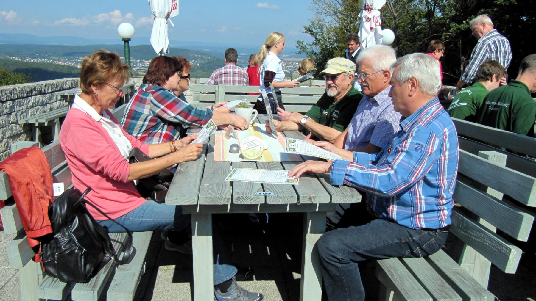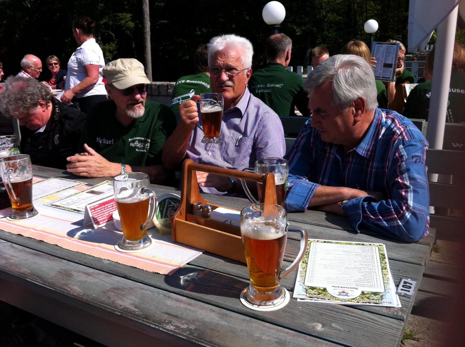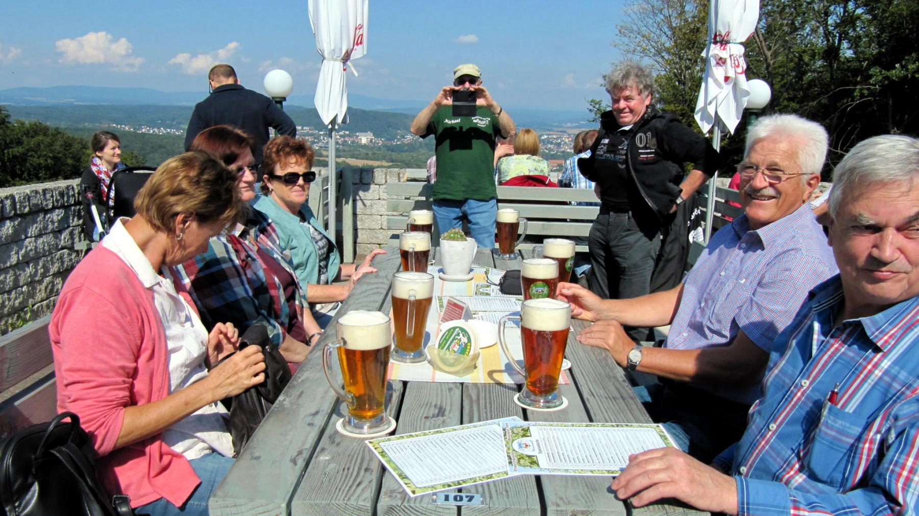 Unser erstes Highlight war der Wittelsbacher Turm und das dazu gehörende Brauhaus oberhalb von Bad Kissingen. Bei herrlichem Sonnenschein konnten wir im Biergarten das selbstgebraute Bier und den herrlichen Ausblick genießen. Natürlich wurde auch beim Essen kräftig zugeschlagen. Man wollte ja schließlich noch den Turm besteigen.