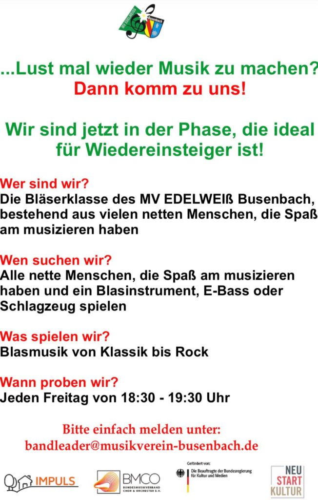 Seit dem zwölften Januar befinden sich die Erwachsenenbläserklasse, das Jugendorchester und unser Großes Blasorchester wieder im Probebetrieb. Ebenso haben unsere Instrumentallehrer wieder mit Ausbildung unserer JuggmusikerInnen begonnen.