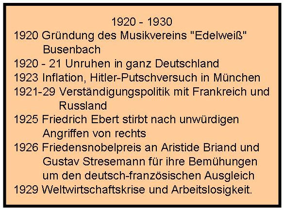Das Gründungsjahr 1920 war zu Beginn geprägt von großen wirtschaftlichen Schwierigkeiten, die in der Inflation von 1923 gipfelten. Der Monatsbeitrag für den Musikverein stieg von 100 Mark im März 1923, 3.000 Mark im Juni ´23, 30.000 Mark im August ´23 , 3 Millionen im Oktober ´23 auf 3 Milliarden im November 1923 an. Der Kassier hechelte erfolglos hinter der Geldentwertung her, aber zum Glück war im November 1923 der Spuk zu Ende. Schriftführer Josef Bauer vermerkte im Protokollbuch: „Durch die rasche Geldentwertung wurde der Betrag von 3 Milliarden nicht überall kassiert.“ Die Verwaltung legte aber umgehend den neuen Beitrag auf Zehnpfennig Gold fest und verordnete, dass die Novemberbeiträge mit zehn Goldpfennigen nachzuzahlen sind.