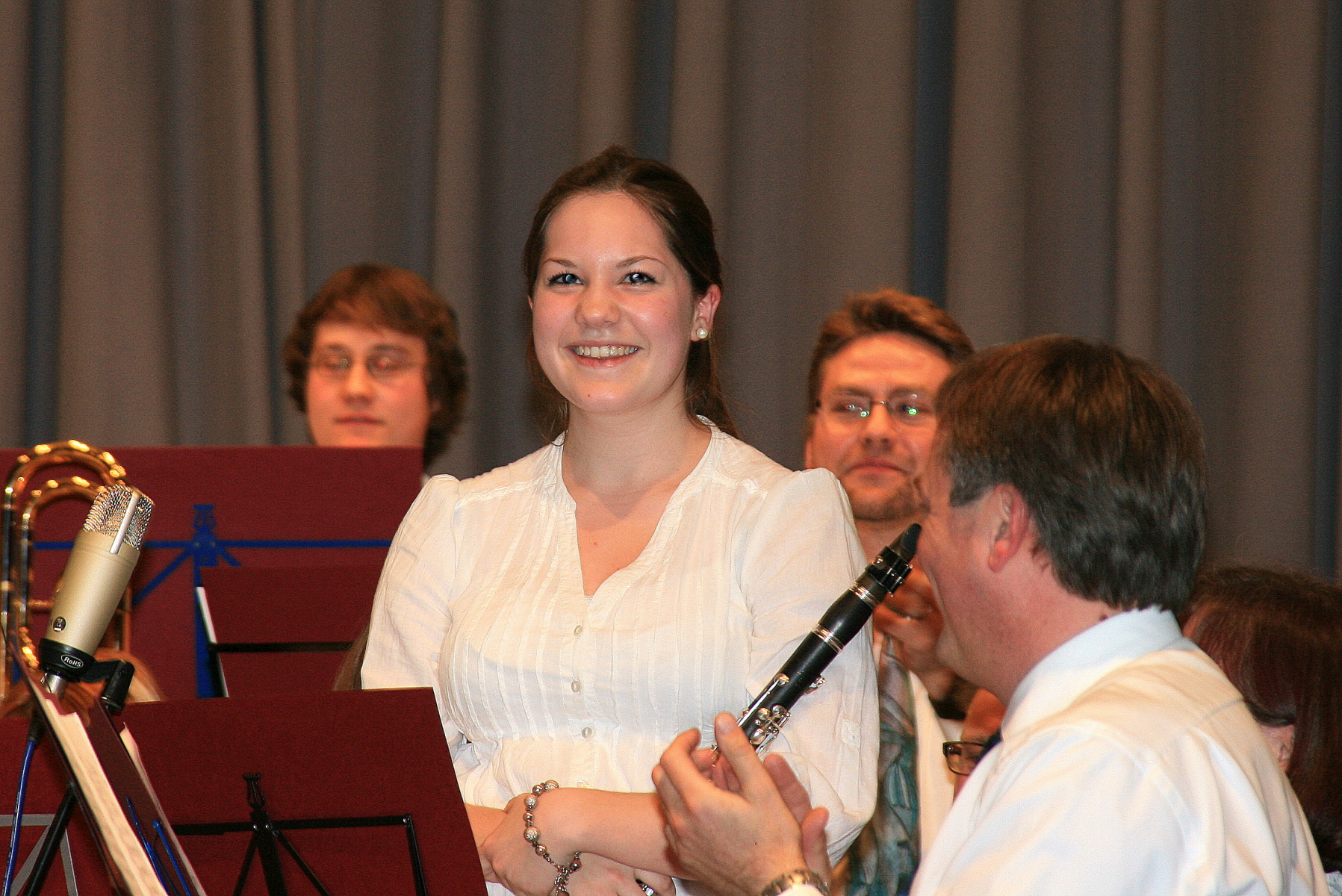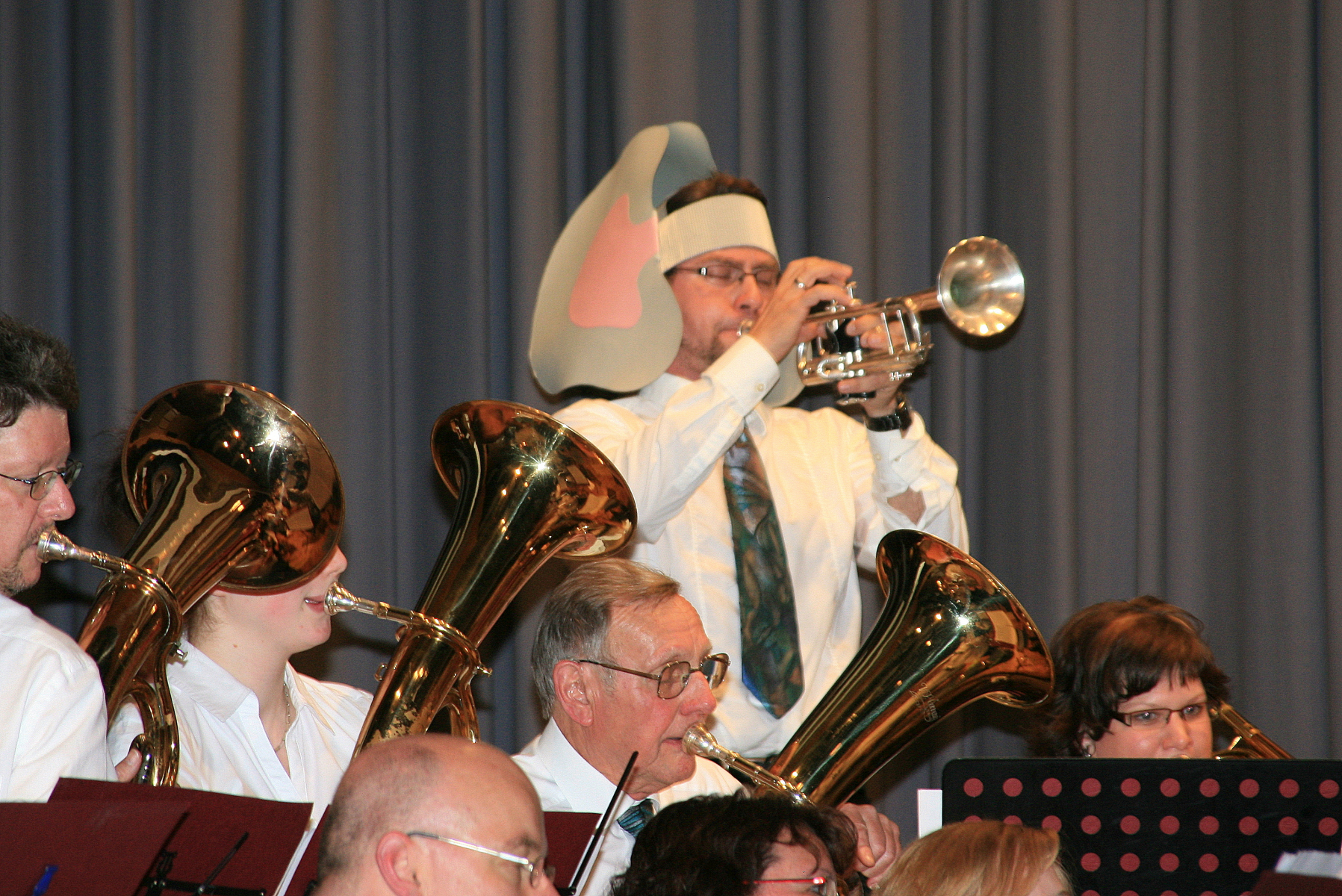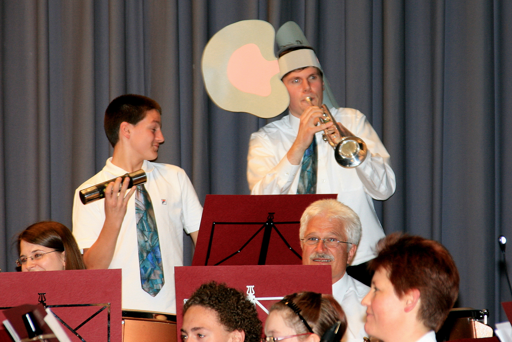 Für den lebhaften Applaus bedankten sich die Musiker mit Zugaben, darunter dem Deep Purple-Klassiker „Smoke on the Water“ und „Ai Se EU Te Pego“ als Geburtstagsständchen für ihren „Mixer“, der just an diesem Tag seinen 50. feierte und als willkommener Anlass zu einer kleinen Showeinlage zwischen Dirigent Dietmar Schulze und Geburtstagskind Michael Trautmann genutzt wurde.