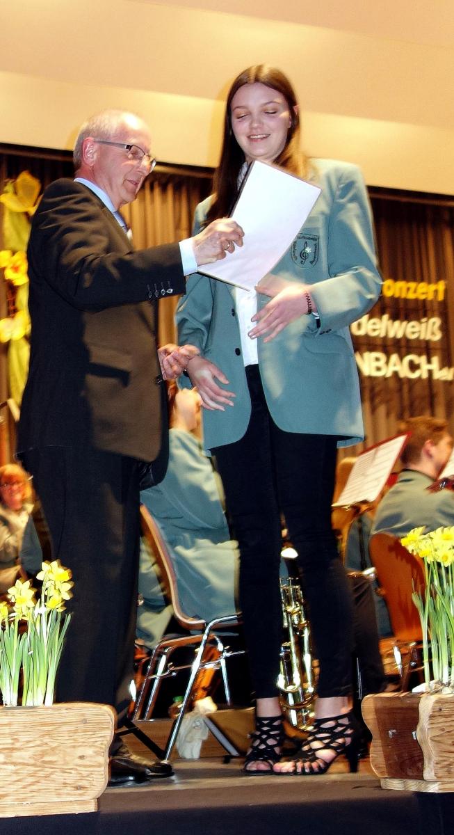 Im Rahmen des Konzerts wurden langjährige Aktive geehrt. Lara Trautmann, seit 10 Jahren aktiv, erhielt die Ehrennadel in Bronze des Blasmusikverbandes Karlsruhe (BVK) und hat die Prüfungen zum Jungmusiker-Leistungsabzeichen in Gold an der Akademie in Staufen erfolgreich abgelegt. 30 Jahre aktiv ist Danny Mock, dafür gab es die Goldene Ehrennadel des BVK. Die Große Goldene Ehrennadel des Bundes Deutscher Blasmusikverbände erhielt für 50 Jahre Musizieren Harald Reiser. Die Ehrungen überbrachte im Auftrag des Verbands Günter Geisert, der stellvertretende Vorsitzende des Blasmusikbezirks Albtal.