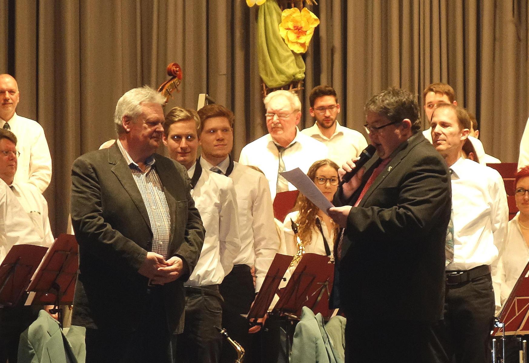 Eine besondere Ehrung hatte der Verein für seinen langjährigen Kassier Hans-Peter Kreutz parat. Er hatte nach 32 Jahren bei der Mitgliederversammlung sein Amt in jüngere Hände gelegt. Für seine Verdienste als Kassier ernannte ihn der Verein zum Ehrenkassier und zum Ehrenmitglied und vollzog die Ehrung öffentlichkeitswirksam beim Konzert in großem Rahmen.