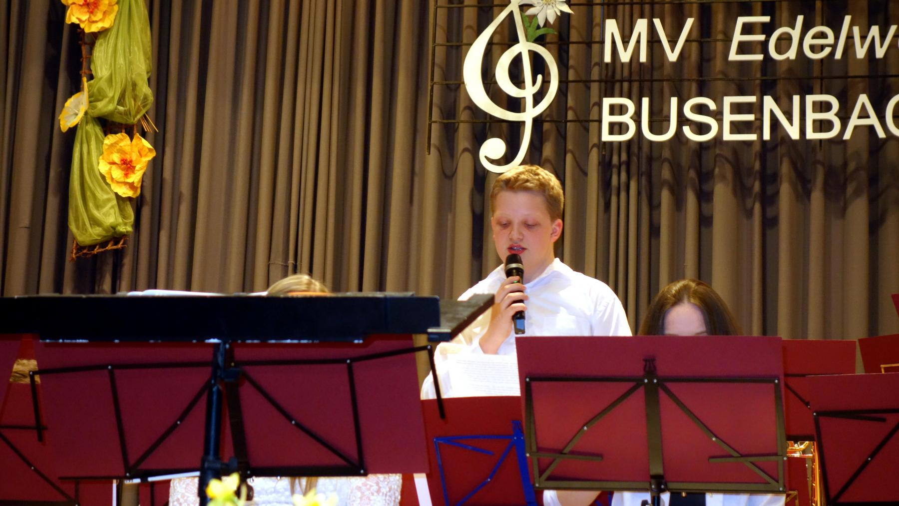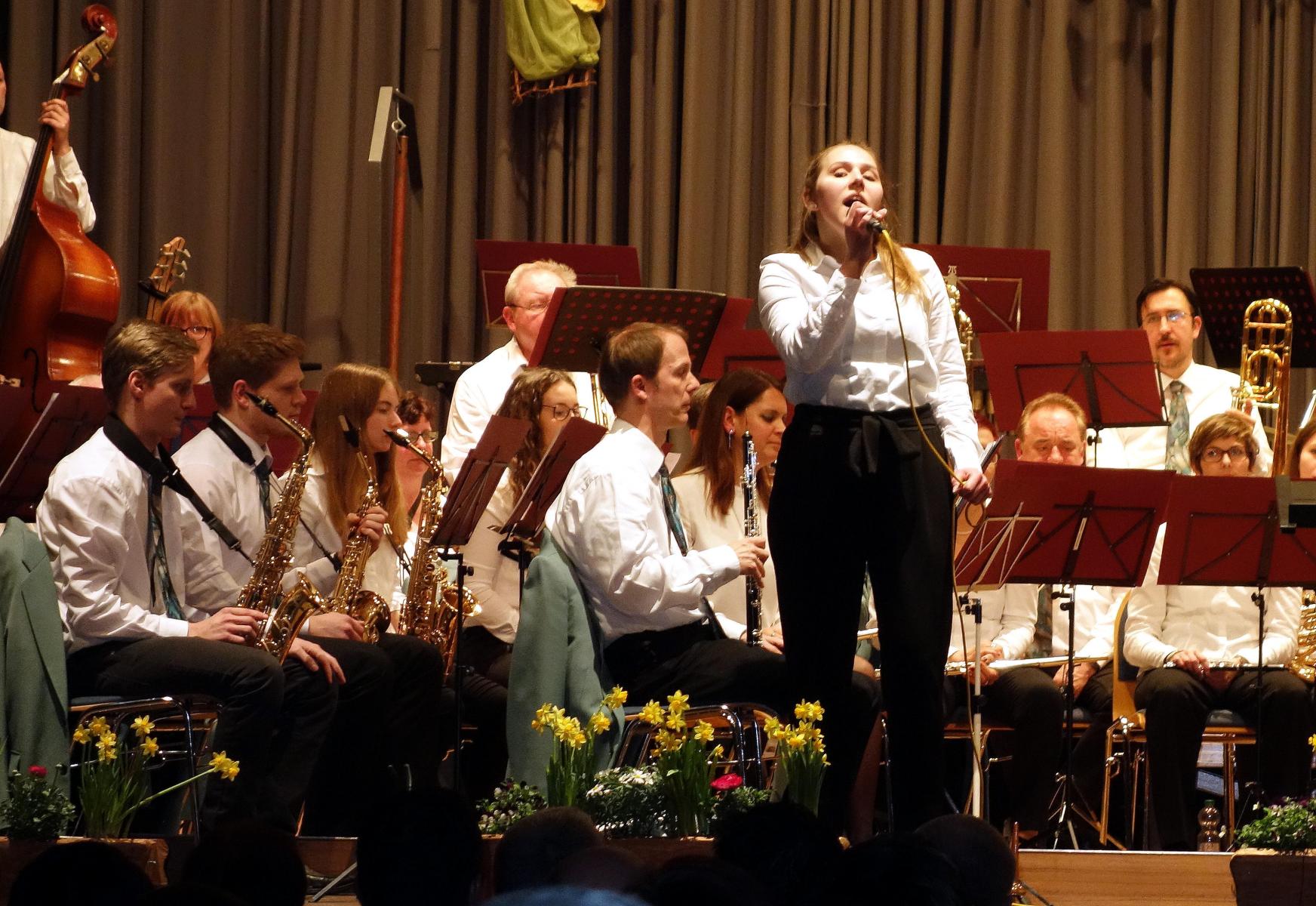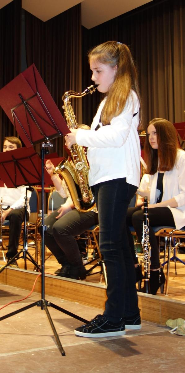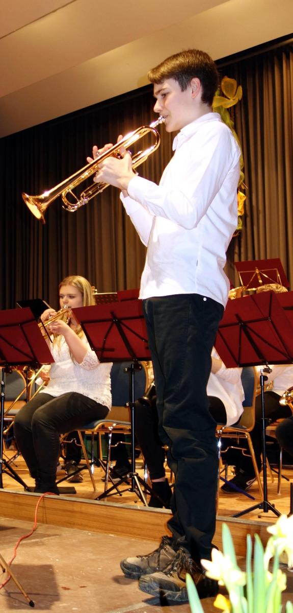 Eröffnet wurde das Konzert durch das Jugendorchester, das erstmals unter der Leitung von Dietmar Schulze stand. Mit „Young Fanfare“ von Martin Scharnagl eröffneten sie ihr Programm. Bei beiden folgenden Stücke, „Jazzy Sax“ und „Cool Brother„, beide von Ivo Kouwenhoven, war Gelegenheit zwei junge Musiker als Solisten vorzustellen: Mattea Mayer (Saxophon) und Jonas Weickenmeier (Trompete) beeindruckten mit ihrem sicheren Spiel. Mit „That’s all“ von Thomas Buß und einer Zugabe beendete die Jugend ihren Programmteil, durch den Leon von der Forst führte.