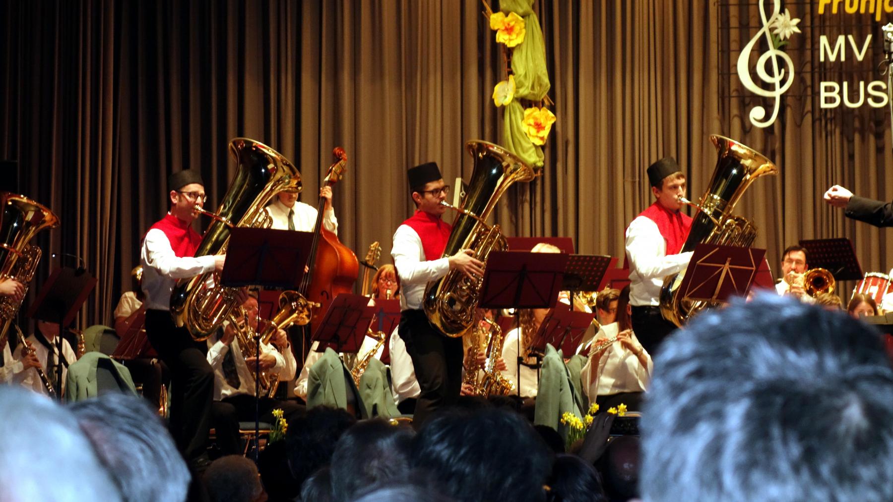 Für den lebhaften Beifall bedankten sich die Musiker mit vier Zugaben, darunter dem Solo für Bässe über das Kinderlied „Ein Männlein steht im Walde„, das den vier Tubisten des Musikvereins Gelegenheit gab, ihr Können zu demonstrieren. Das Gleiche galt anschließend für die Saxophongruppe mit dem Glenn-Miller-Hit „In the Mood“, bei dem auch Dietmar Schulze selbst zum Saxophon griff. Da der Beifall nicht nachließ spielten die Musik zunächst „Dob’s Boogie“ und zum Abschluss „My dream“ mit dem Flügelhornsolo von Danny Mock.