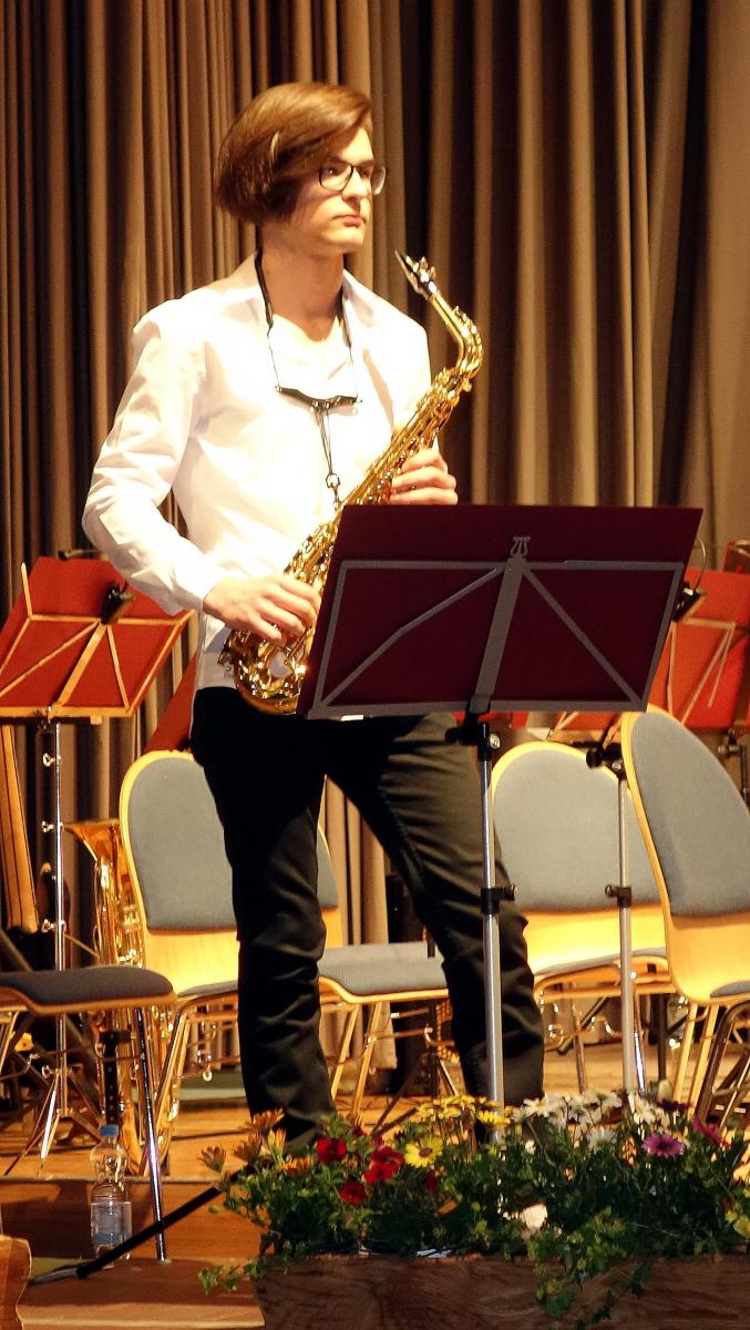 Vorsitzender Alexander Huber konnte unter den zahlreichen Zuhörern auch Waldbronns Bürgermeister Franz Masino und Günter Geisert, den stellvertretenden Vorsitzenden des Blasmusikbezirks Albtal begrüßen. Der zeichnete im Verlauf des Abends im Auftrag des Blasmusikverbands Karlsruhe Daniel Kreutz mit der Silbernen Ehrennadel aus. Kreutz ist seit 20 Jahren als Tubist aktiv.