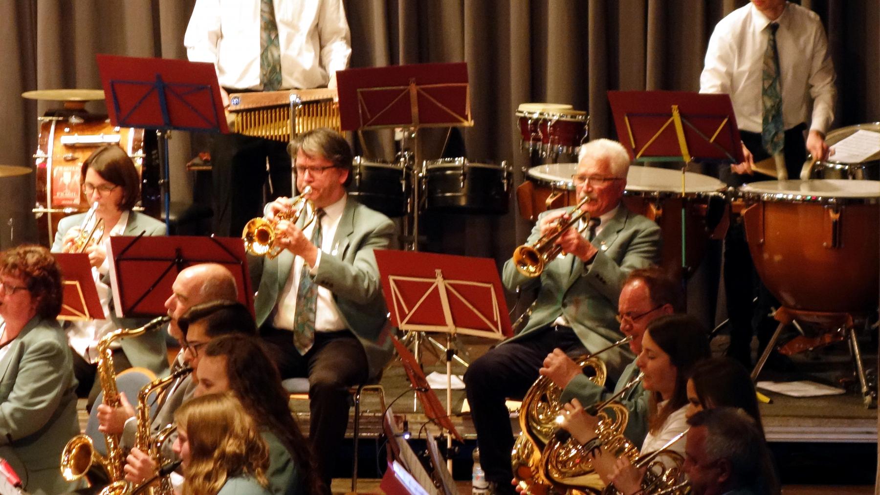 Mit der Ouvertüre „Persis“ von James L. Hosay eröffnete das Große Orchester unter der Leitung von Dietmar Schulze seinen Programmteil. Orientalische Klänge, eine farbenreiche Instrumentierung und eine mitreißende „Jagd“ machen „Persis“ zu einem wirkungsvollen Konzertwerk, dem das Orchester unter der temperamentvollen Leitung Schulzes die nötige Dramatik verlieh. Es folgten „Schmelzende Riesen“ von Armin Kofler. Der Gedanke hinter dem Werk ist die Klimaerwärmung, die sich auch in Mitteleuropa nicht zuletzt durch den Rückzug der alpinen Gletscher bemerkbar macht. Unterstützt wurde die Interpretation durch eingespielte Filmaufnahmen. Den ersten Teil beschloss „Ein Freund, ein guter Freund“ von Werner Richard Heymann mit den Posaunisten Ronja Trautmann, Mark Huber, Frank Pottiez und Eric Schmidt als Solisten.