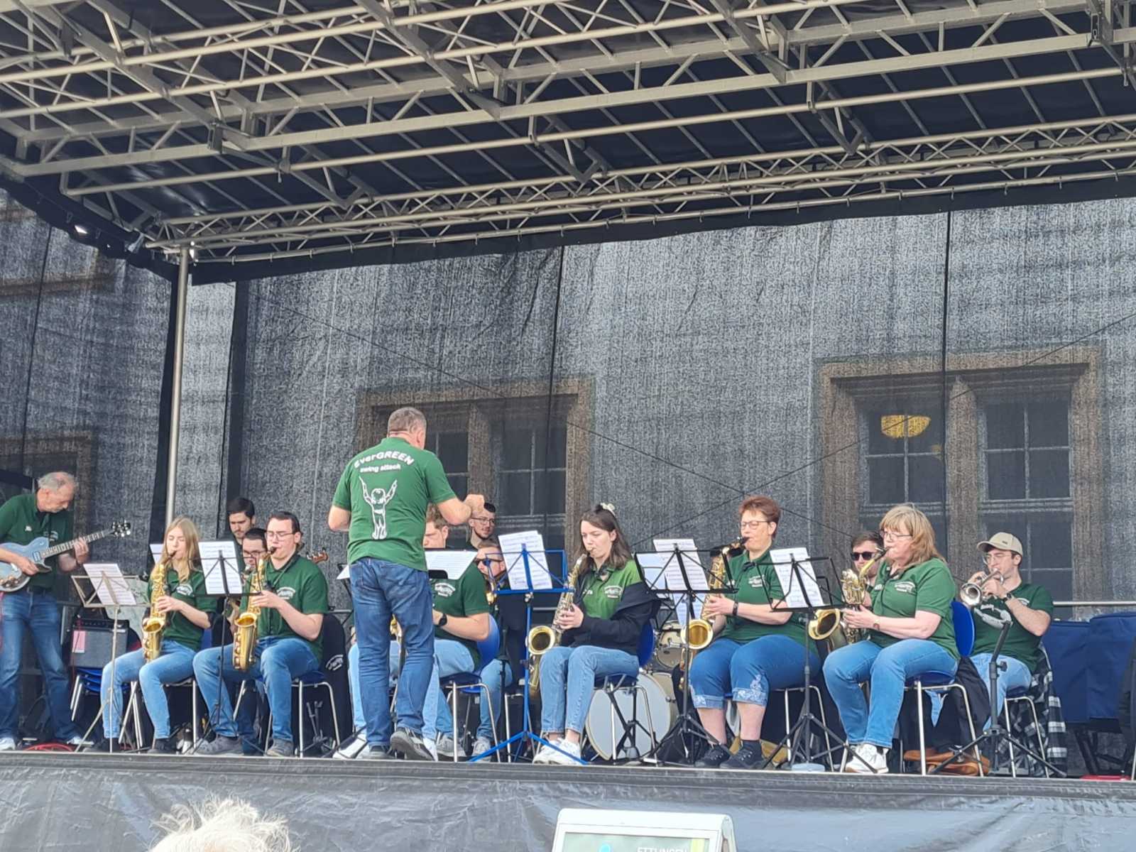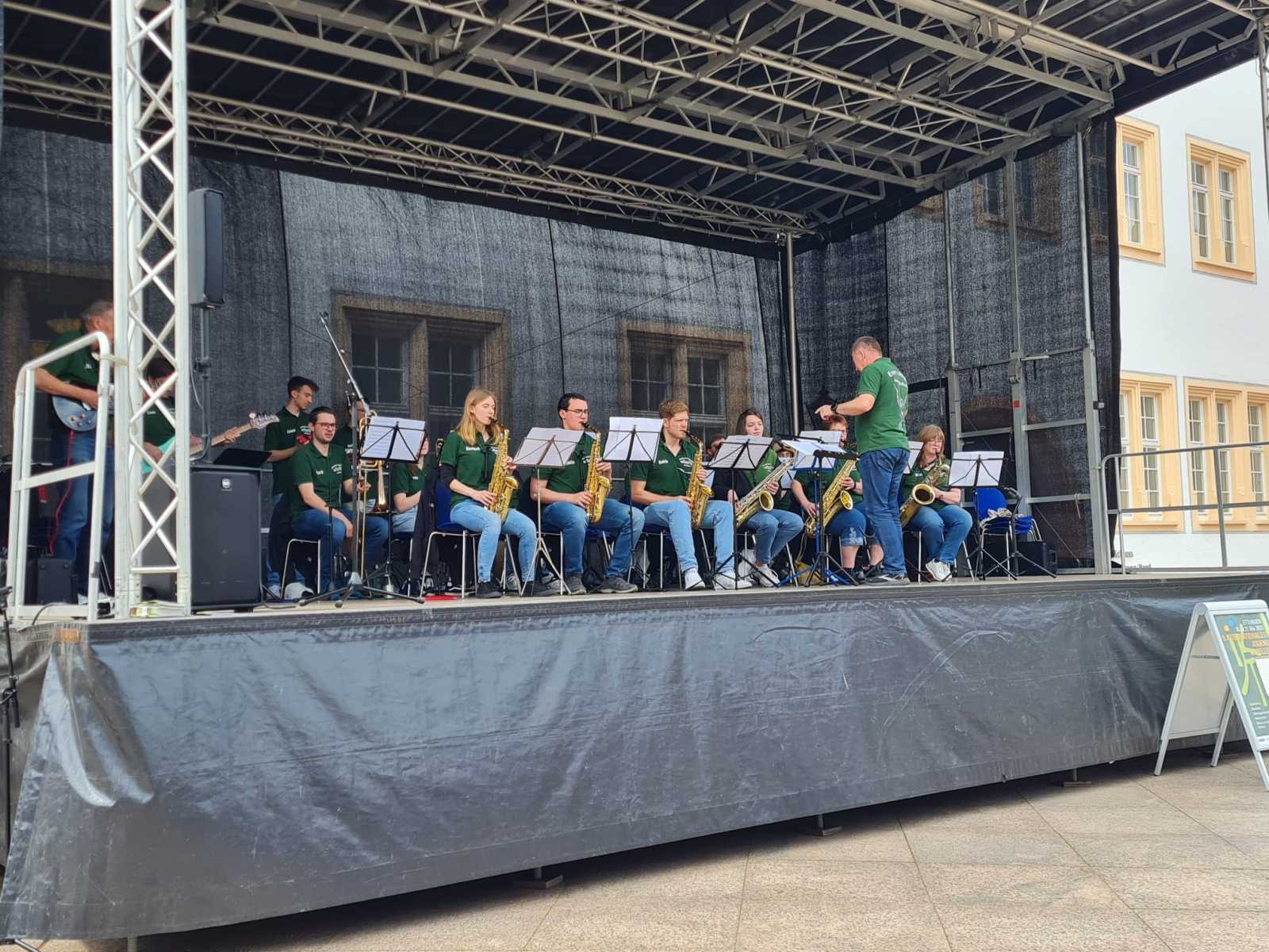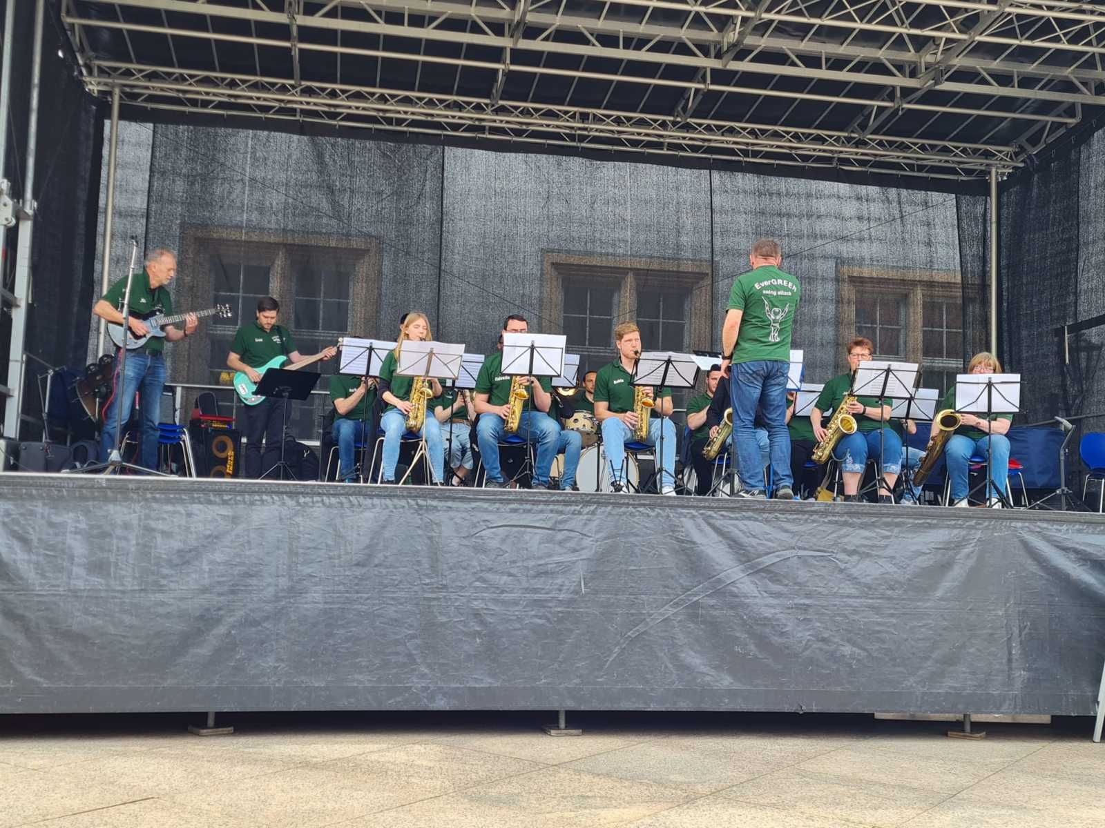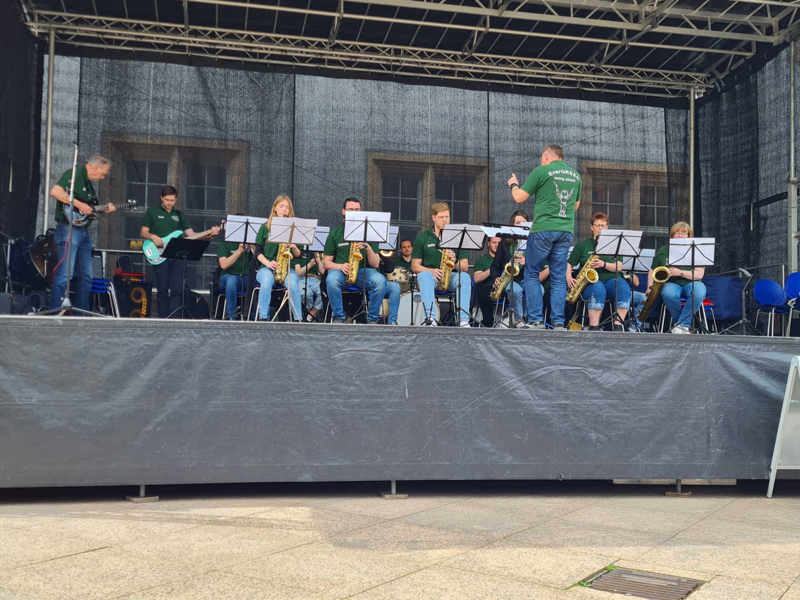 Am vergangenen Wochenende fand das 9. Internationale Jugendkapellentreffen in Ettlingen statt. Ausrichter war dieses Mal der Bund Deutscher Blasmusikverbände. Der Musikverein Busenbach beteiligte sich nicht nur bei der Bewirtung der Abendveranstaltungen in der Schlossgartenhalle, sondern auch musikalisch mit einem Platzkonzert auf der Open-Air Bühne vor dem Ettlinger Schloss. Die Formation everGREEN swing attack unterhielt am Samstagvormittag ab 12 Uhr für eine Stunde mit Titel aus Swing, Pop, Rock, sowie moderner Blasmusik. Anbei finden Sie ein paar Impressionen vom Auftritt.