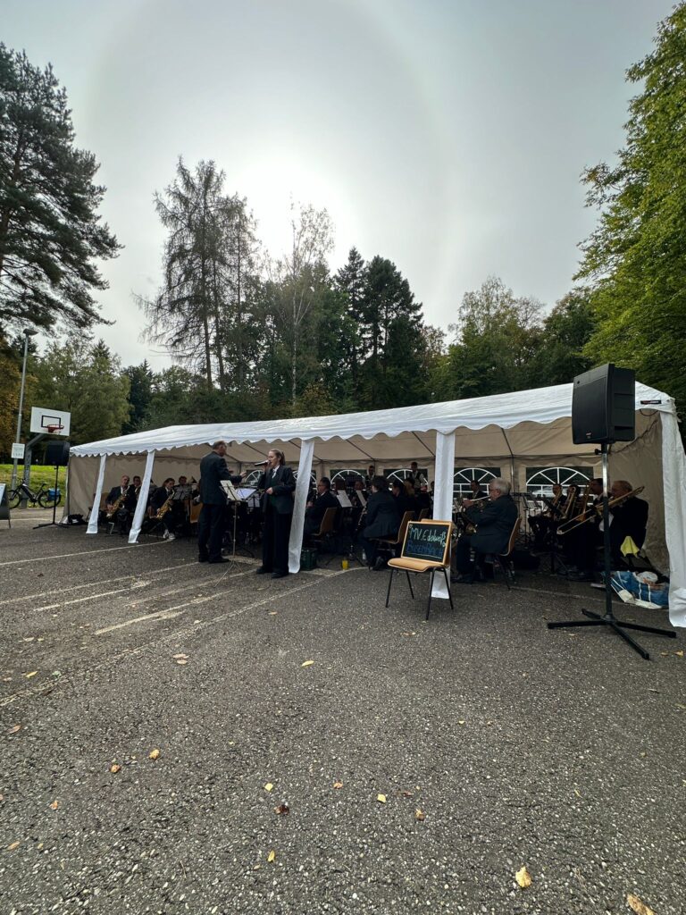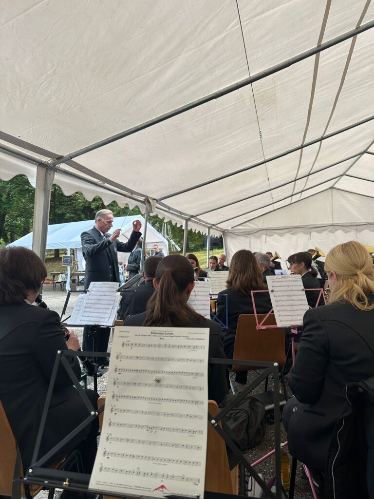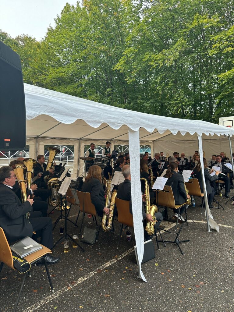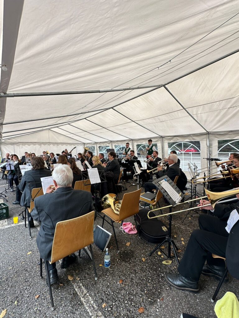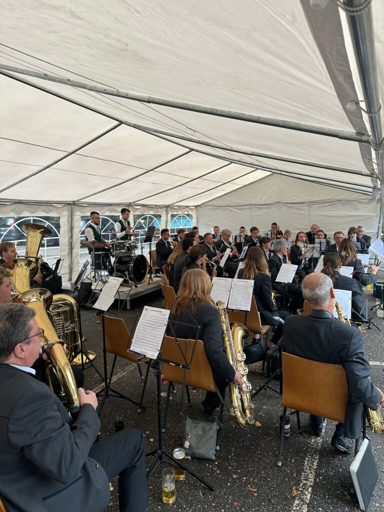Mit vielen Zugaben beschloss die Jugendkapelle den offiziellen Teil der Veranstaltung, und Eric Schmid verabschiedete die Gäste mit einer persönlichen Anekdote zur Blasmusik, aus seiner gerade zurückliegenden USA-Reise. Dabei verdeutlichte er die Bedeutung und Wirkung der Blasmusik auf viele Menschen im Vergleich zu anderen Werbemaßnahmen. Zum Ausklang des Vormittags wurde im gemütlichen Beisammensein bei Weißwürsten, Brezeln und Bier gefeiert. Eine Blechbläserformation um Danny Mock sorgte für eine heitere Stimmung, sodass der Vormittag für alle Anwesenden in geselliger Atmosphäre ausklang.