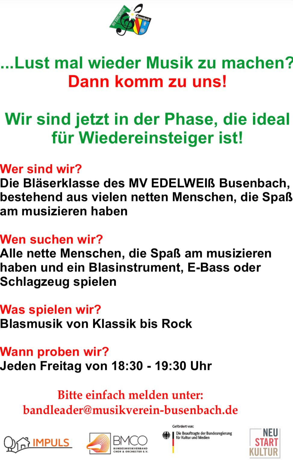 Schon einmal daran gedacht das eingestaubte Instrument aus dem Keller zu holen und wieder zu musizieren? Dann komme jetzt zum MVE Busenbach!