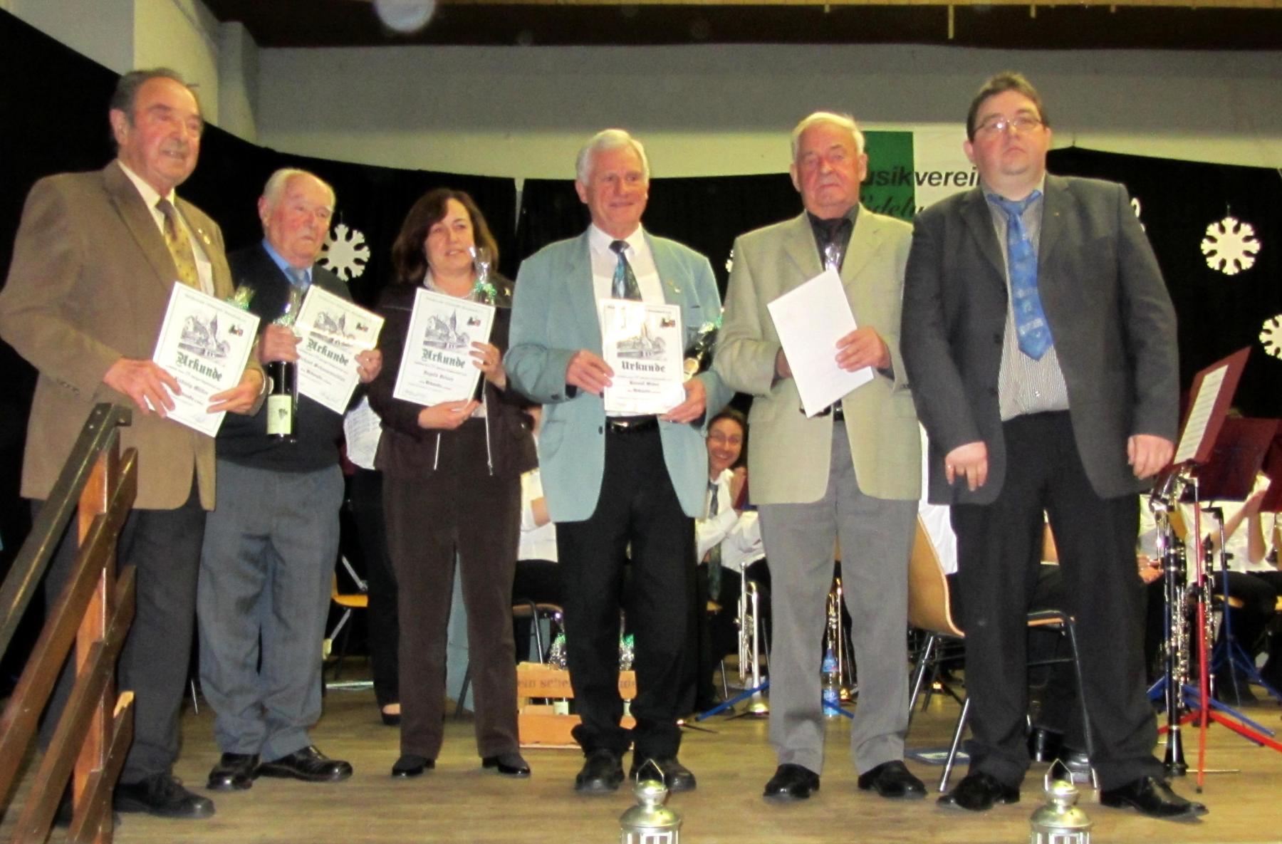 Für 60 Jahre Mitgliedschaft beim Busenbacher Musikverein erhielten Ewald Kunz, Werner Reiser, Willi Reiser, Franz Vogel und Konrad Weber eine Ehrenurkunde.